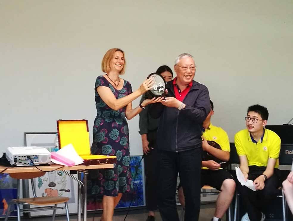 Schließlich bedankte sich Herr Wang, der Leiter der Jiangqiao Shiyan Zhongxue, beim Gymnasium Naunhof im Namen aller Austauschschüler und Lehrer der China Exchange Group mit einem ein Geschenk für die interessante Zeit in Naunhof.
