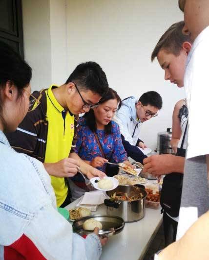 Kaum ein Schüler der Schule konnte der Versuchung widerstehen, chinesisches Essen zu kosten. In einer langen Schlange warteten alle geduldig, um chinesisches Essen, wie zB. Frühlingsrollen, gebratene Nudeln, Baozi oder die bekannten Teigtaschen, zu probieren. Nach der Kostproben konnte jeder einen duftenden selbstgemachten Tee genießen.