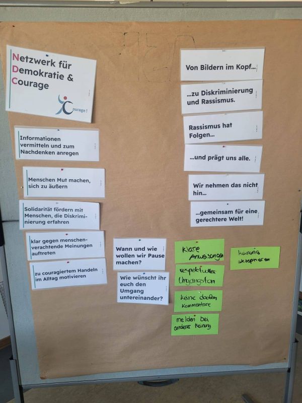 Das Netzwerk für Demokratie und Courage gestaltete am Freien Gymnasium Naunhof Projekttage für die Klassenstufen 8 und 9. Die ehrenamtlichen Projektleiterinnen und Projektleiter griffen dabei die Themen Diskriminierung und couragiertes Handeln auf. Im Mittelpunkt ihrer Arbeit steht die demokratiefördernde Bildung junger Menschen in Sachsen. Mithilfe partizipativer Methoden erlebten die Schülerinnen und Schüler Formen demokratischen Miteinanders. Ziel war es, den Jugendlichen Argumentations- und Handlungsmöglichkeiten an die Hand zu geben, um sich gegen diskriminierende und menschenverachtende Haltungen zu positionieren. Darüber hinaus wurden Mitbestimmungsmöglichkeiten im Alltag aufgezeigt.
