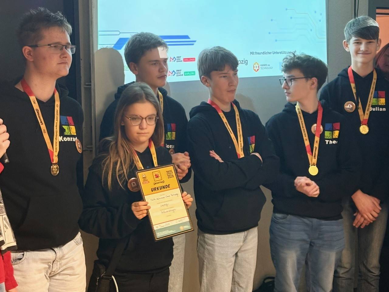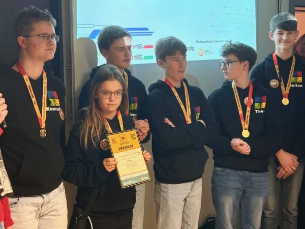 Frieda (6. Klasse), Jonas, Julian, Konrad, Merlin und Theo (alle Klasse 9) haben sich seit Beginn des Schuljahres mit dem offiziellen Spielfeld vorbereitet und versucht, einen Roboter zu bauen, der so viele Aufgaben wie möglich auf diesem lösen kann. Am Tag des Wettbewerbs haben sie ihren Roboter mit dem Spitznamen “Heinz 1” und seine Programmierung in drei Runden antreten lassen. Außerdem musste das Team ein Forschungsthema entwickeln, vor der Fachjury vortragen und sich den kritischen Fragen stellen. Im Roboterwettkampf konnten am Ende solide 180 Punkte und somit ein 6. Platz erzielt werden. Sicherlich war mancher am Ende etwas enttäuscht über das Ergebnis, da im Probelauf am Morgen noch deutlich mehr Punkte von den Schiedsrichtern gewertet wurden. Nichtsdestotrotz war der Tag ein voller Erfolg, da man viel Neues gelernt hat, sich mit den anderen Teams und ehemaligen Teilnehmern austauschen konnte und einfach eine Menge Spaß hatte.