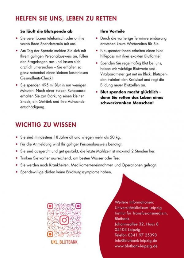 Blut spenden heißt Leben retten. Jeder kann in eine Situation kommen, in der er zum Überleben Blut eines anderen Menschen braucht. Im Universitätsklinikum Leipzig und den umliegenden Krankenhäusern gibt es aktuell einen hohen Bedarf an Blutkonserven.