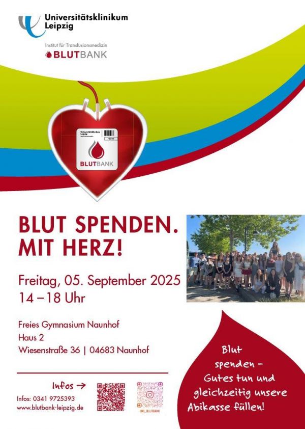 Die Blutspende wird am Freitag, den 05.09.2025 von 14 Uhr bis 18 Uhr am Freien Gymnasium Naunhof, Wiesenstraße 36, Haus 2 stattfinden.