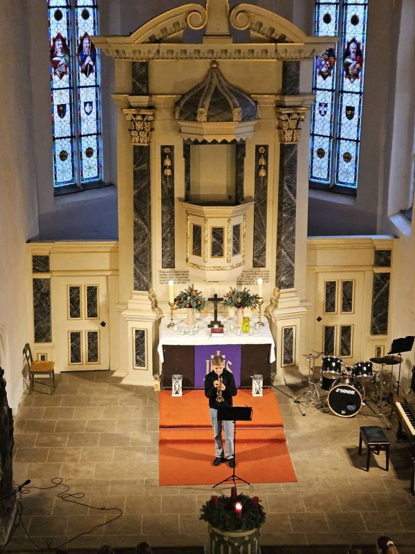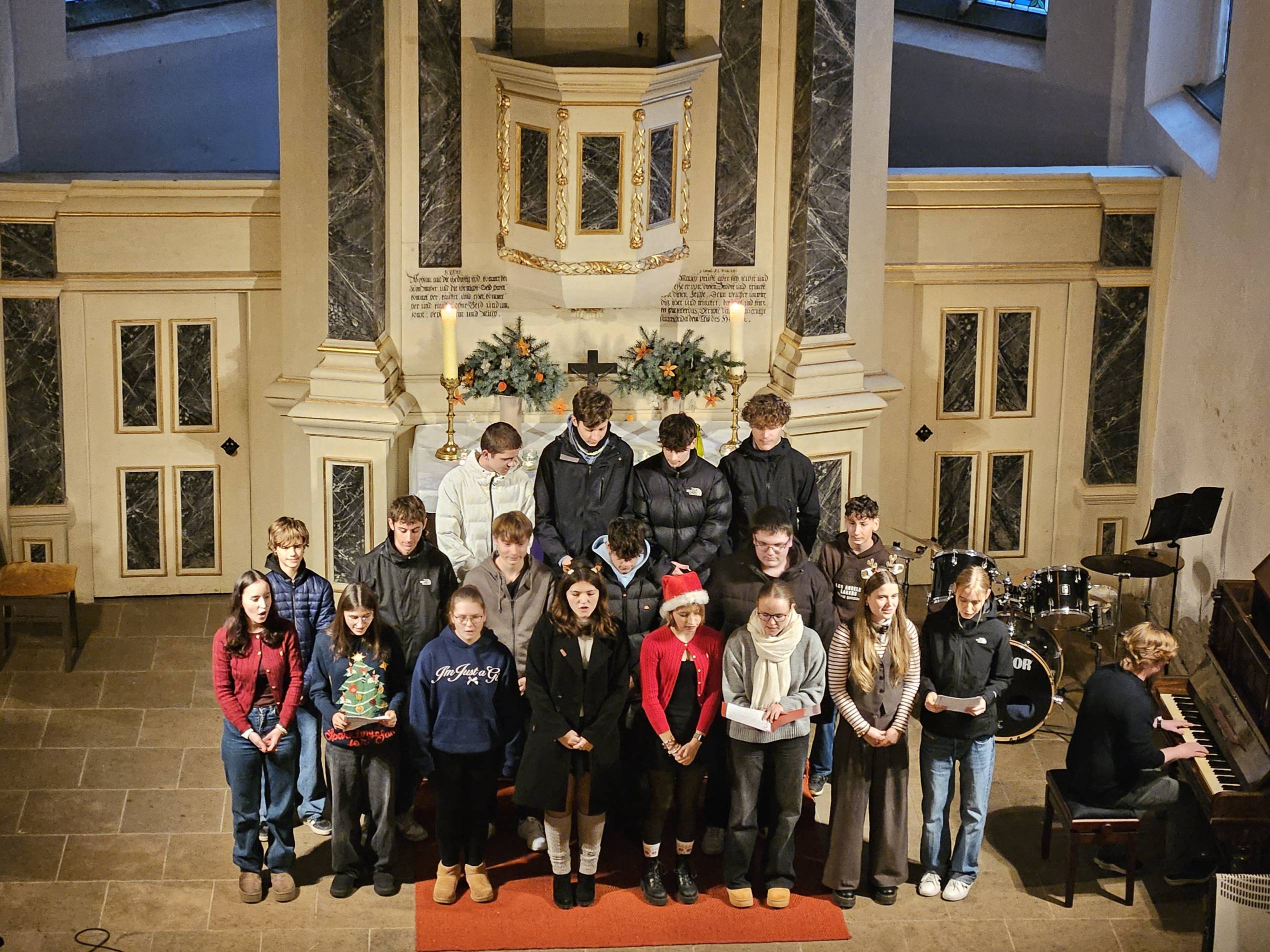 Mit „Carol of the Bells“ sorgten die Klasse 10.2 sowie Tony und Leonard aus der 8.2 für Gänsehaut. Josua (8.3) überzeugte mit „Es wird schon gleich dunkel“, bevor Chiara und Mia (5.3) das Publikum mit ihrer Version von „O Tannenbaum“ verzauberten. Für ein besonderes Highlight sorgte Janne (6.2), der mit „Bohemian Rhapsody“ das Publikum staunen ließ. Mit „Alle Jahre wieder“ und „Jingle Bells“ brachte Charlotte (5.1) klassische Weihnachtsmelodien in die Kirche, bevor ein feierlicher Moment folgte: die Vokationsübergabe an Herrn Curio, der offiziell in den kirchlichen Schuldienst aufgenommen wurde. Danach erklang erneut „O Tannenbaum“, dieses Mal vorgetragen von Freia und Jasmin (8.1).